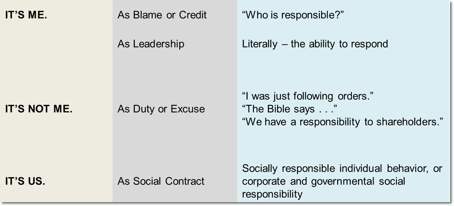 I created the table below to illustrate a few of the ways that people think about responsibility. The first use actually address the difference between responsibility and accountability. Accountability is liability, and demands some sort of response. You can be responsible by being accountable.